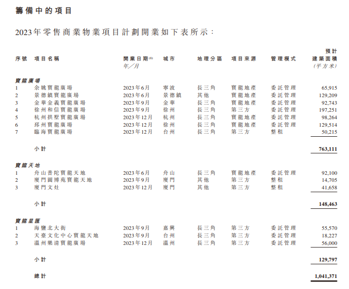 在夯实业务发展方面,宝龙商业2023年开业项目不少于13个,约100万平方米 ,其中宝龙广场7个、宝龙天地3个、宝龙星汇项目3个,主要集中在长三角地区。