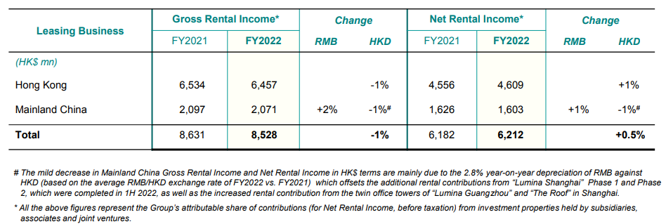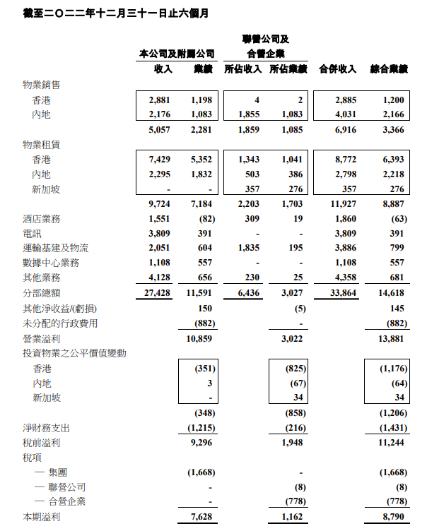 香港投资物业收入11.99亿港元,按年下跌7.1%;毛利为9.27亿港元,计入联营公司及合营公司之贡献,集团香港合并租赁收入共13.52亿港元,而2021年为14.55 亿港元。若不计入在2022年上半年向租户提供的一次性租金宽减,以及香港两个已出售货仓的租赁收入,香港投资物业收入为11.42亿港元,同比下降2.6%;