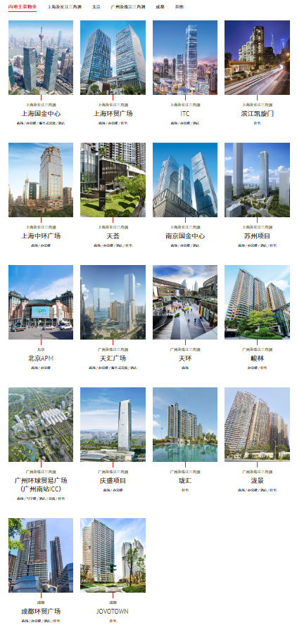 从2022年底出租率来看,公告显示,北京「环球金融中心」出租率91%;上海「六八八广场」为95%;上海「港汇中心二座」97%;上海「恒基名人商业大厦」办公楼96%,上海「环智国际大厦」办公楼出租率为91%。