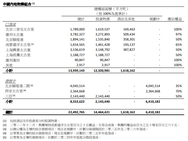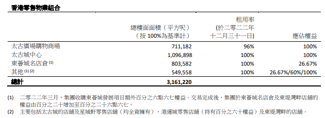内地办公楼物业方面,2022年,太古地产来自中国内地办公楼物业的租金收入总额下跌4%至3.65亿港元。撇除人民币价值变动,租金收入总额大致相同。