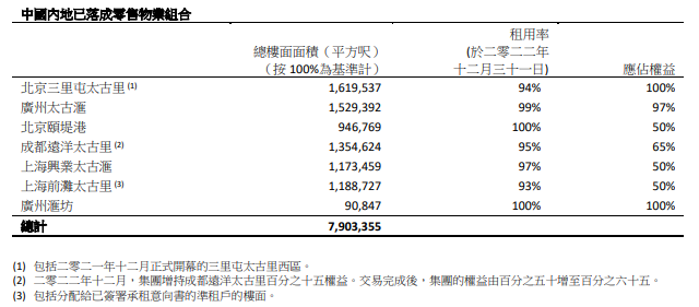 内地的零售业务方面,中国内地的商场销售额于2022年初表现强劲,但由第二季开始,太古地产旗下六个商场因疫情和随之而来的封控措施而有不同程度上的影响,当中对上海及北京的影响尤甚。2022年,太古地产中国内地应占零售销售额 (三里屯太古里西区和前滩太古里除外)下跌20%。北京三里屯太古里及颐堤港、广州太古汇、成都远洋太古里和上海兴业太古汇的零售销售额分别下跌26%、26%、11%、15%及36%,而中国内地整体零售销售额则下跌0.2%。截至2022年末,北京三里屯太古里、广州太古汇、北京颐堤港、成都远洋太古里、上海兴业太古汇的出租率分别为94%、99%、100%、95%、97%,此外,2022年底,上海前滩太古里租戶已承诺(包括签署承租意向书)租用93%的零售楼面,83%的可出租零售楼面已开业。