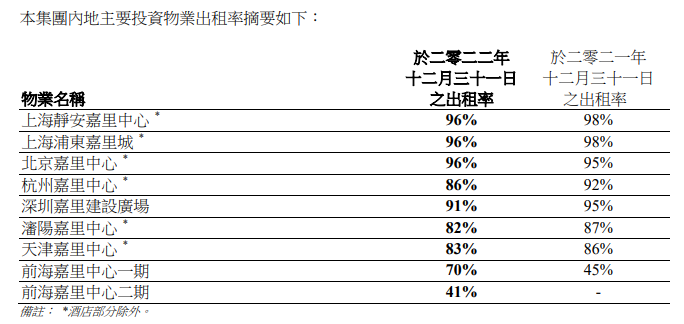 内地零售组合出租率平稳,分部整体出租率为83%,2021年为88%。集团最新开业的前海嘉里中心一期的商场录得出租率 73%。办公室组合表现坚韧,整体出租率为88%,2021年为86%。
