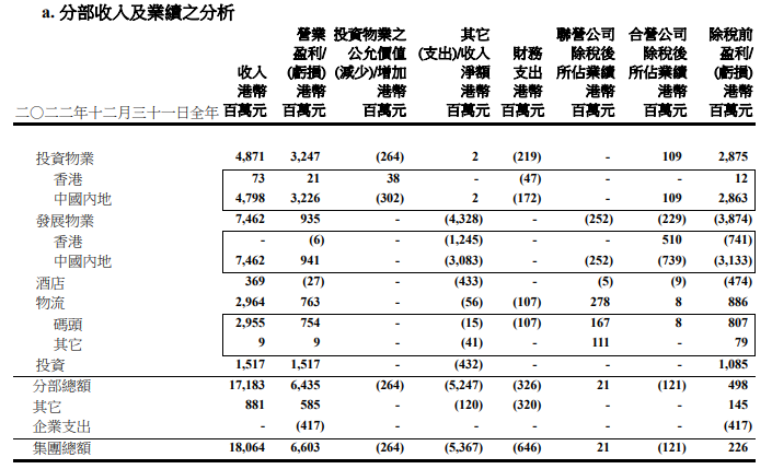 此外,业绩公告指出,中国内地的封控措施及香港的检疫要求限制了2022年大部分时间的人口流动,导致九龙仓集团酒店分部收入3.69亿港元,同比下跌 26%,并录得营业亏损2700万港元。