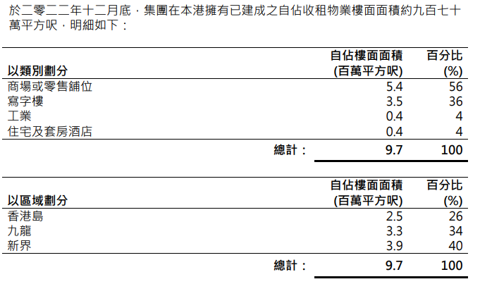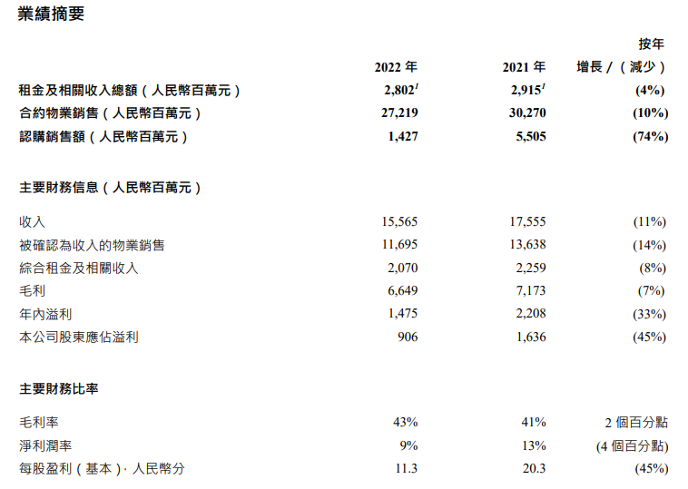 2022年,恒基在香港和内地租金总收入为85.28亿港元,同比下降1%;净租金收入为62.12亿港元,同比略升0.5%。