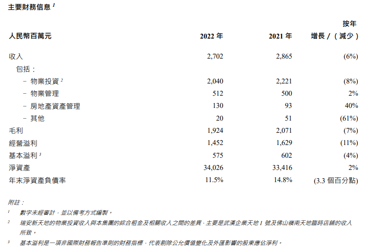 截至2022年12月31日,集团的的物业投资及管理部门「瑞安新天地」全年收入27.02亿元,同比减少6%。