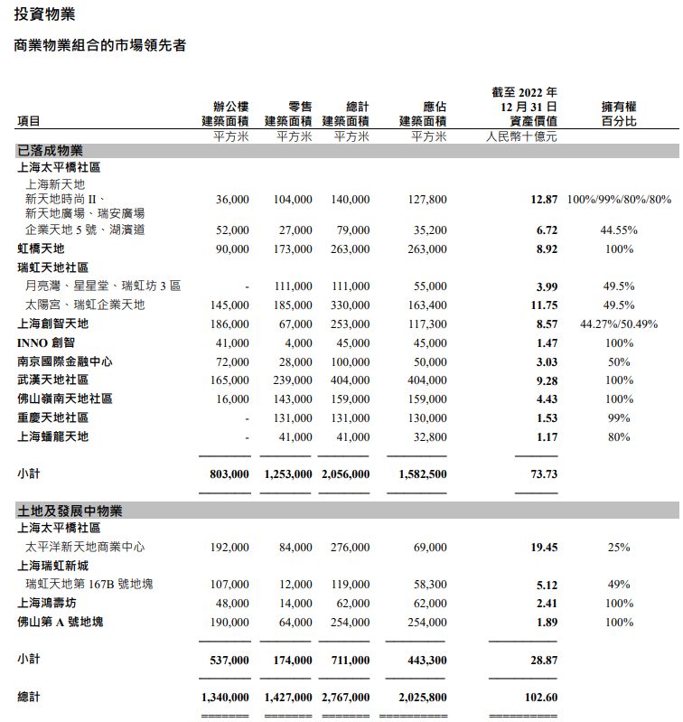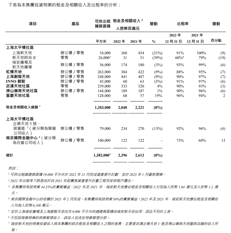 截至2022年12月31日,瑞安新天地拥有及管理11项已落成投资物业及两个合营项目,分别为上海的企业天地5号和湖滨道,以及南京国际金融中心。