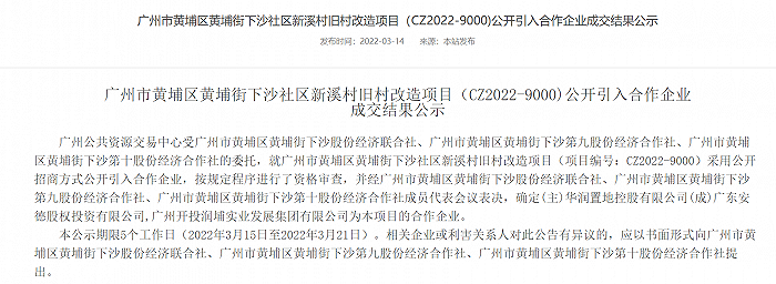 2022年3月14日,广州公共资源交易公共服务平台发布《广州市黄埔区黄埔街下沙社区新溪村旧村改造项目(CZ2022-9000)公开引入合作企业成交结果公示》。公示指出,确定(主)华润置地控股有限公司(成)广东安德股权投资有限公司、广州开投润埔实业发展集团有限公司为黄埔街下沙社区新溪村旧村改造项目的合作企业。