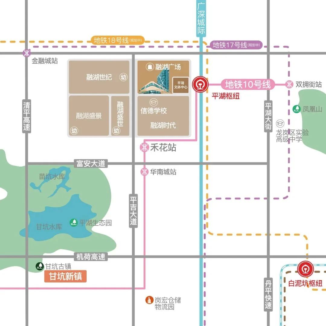 更加值得关注的是,融湖广场坐拥平湖、白泥坑双枢纽格局。其中平湖枢纽汇集7条轨道,借助TOD模式启动城市更新和发展的强劲引擎。根据政府最新划分的平湖枢纽片区范畴,融湖广场恰好位于平湖枢纽范围内,优质的路网结构、完善的交通配套,势必为融湖广场源源不断地输送庞大且高质量的客流群体。