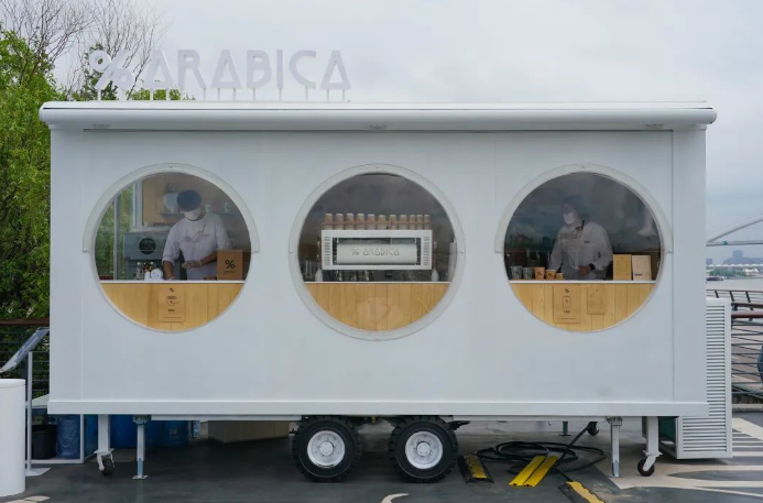 已开业的%arabica集装箱门店以乳白色集装箱和三面球形玻璃罩构成,工业风和现代艺术风相融,形成极具特色的迷你店。值得注意的是,在众多集装箱新面孔之外,星巴克已在此已运营了一年多,且其形态以其经典餐车为造型,由此也让不少人推测,此类餐车正是集装箱式餐饮的“前身”。