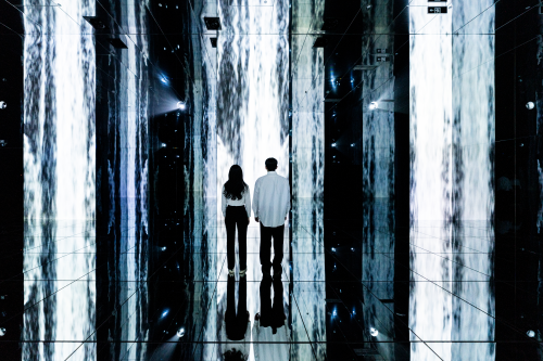 提到瀑布,在不少人的固有认知中,瀑布可能总与山石相伴。《瀑布》一反常态,为观众带来由数字媒体技术创造出的壮观瀑布,带来极致的超现实体验。瀑布从高空倾斜而下,在镜面打造的六面空间中无限延伸,观众在此可见证身处超现实空间中脱离地心引力的震撼奇观。