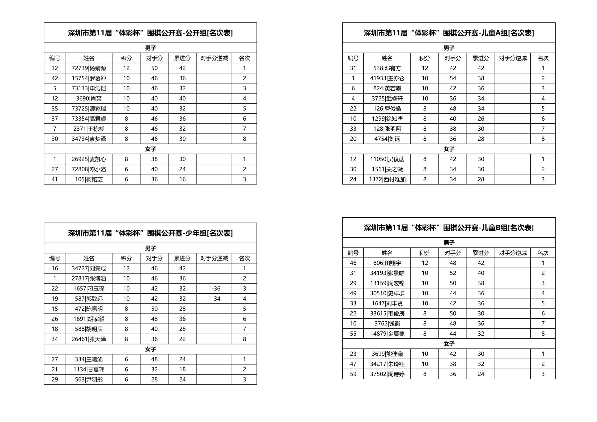由深圳市棋类协会主办、深圳市罗湖区棋牌协会和深圳市奕道青少年棋牌俱乐部协办的深圳市第11届“体彩杯”围棋公开赛于4月29日在宝能·第一空间圆满举行。