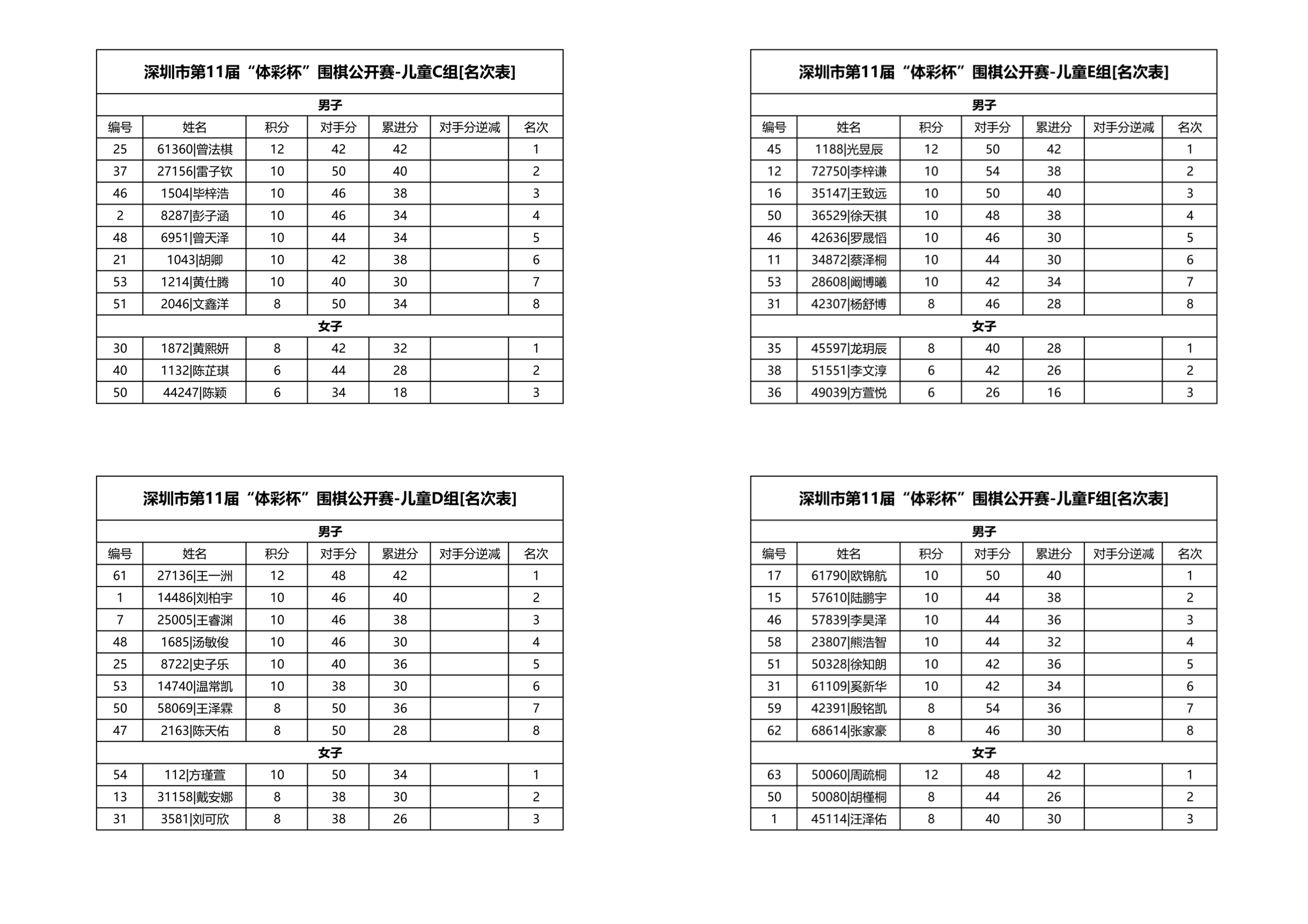 曾法棋、黄熙妍分别获得儿童C组男子、女子冠军;王一洲、方瑾萱获得儿童D组男子、女子冠军;光昱辰、龙玥辰分别夺得儿童E组男子、女子冠军;欧锦航凭借对手分的优势夺得儿童F组男子冠军、周疏桐全胜夺得女子冠军。