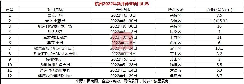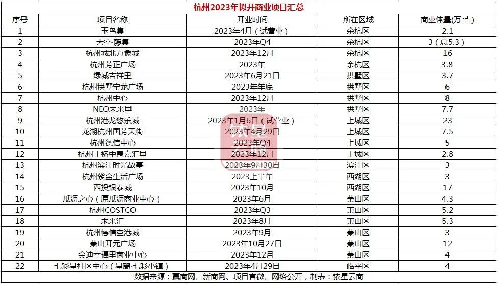 综合业内数据统计,杭州2023年全年预计开业商业项目22个,新增商业体量预计149.4万㎡。其中,玉鸟集、龙湖杭州国芳天街、七彩星社区中心已开业亮相。下文将对2023年杭州拟开业代表项目简要介绍。