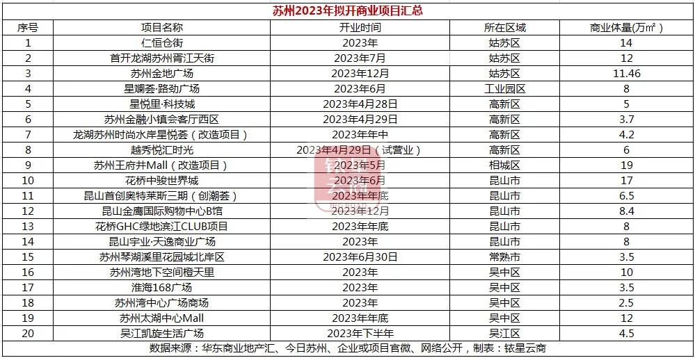 2023年,苏州拟开业购物中心约20家,新增体量约167万㎡,其中仁恒仓街、首开龙湖苏州胥江天街、苏州金地广场、苏州王府井Mall、花桥中骏世界城、苏州太湖中心Mall等项目引关注。下文对2023年苏州拟开业代表项目简要介绍。