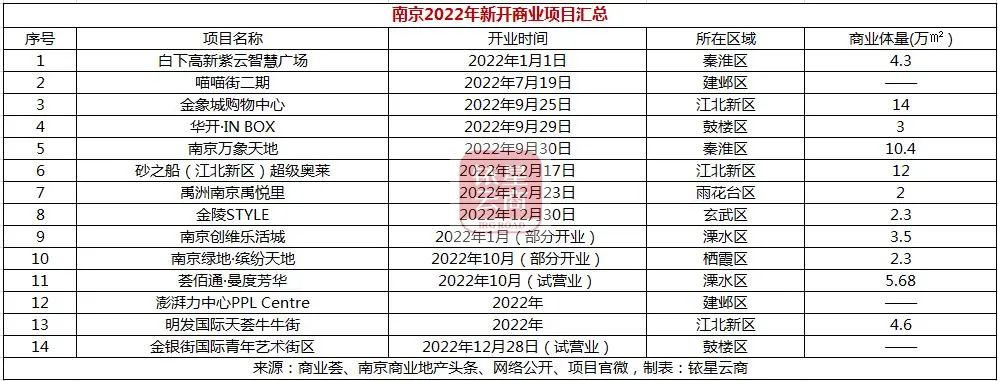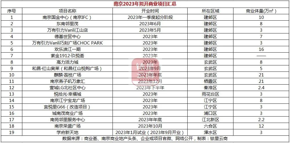 据统计,2023年,南京19个商业体开业,总商业体量138.6万方,其中,新鸿基南京国金中心(IFC)、华润燕子矶万象汇、南京荣盛广场、德基世贸中心、华侨城欢乐滨江一期、江宁宝龙广场等项目较受大众关注。