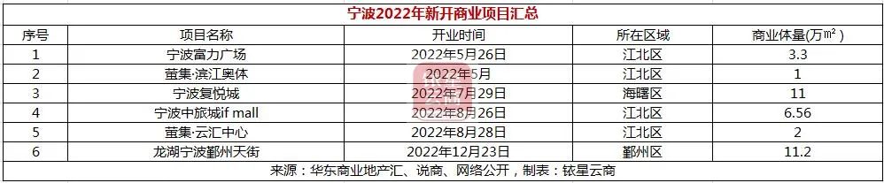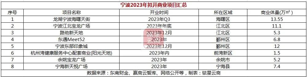 据不完全统计,宁波2023年预计开业的新商业项目有8个,新增商业体量62.85万方。其中,龙湖宁波海曙天街、宁波江北宝龙广场、路劲新天地、宁波东部印象城等项目颇受关注。
