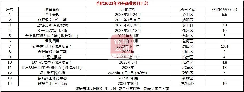 2023年,合肥预计有14个商业项目开业,总体量约93.1万㎡。其中,合肥荟聚、银泰中心二期、金地·方邻|合肥北城已正式营业。