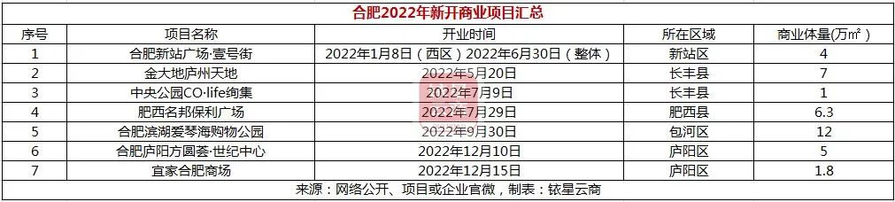 合肥产业结构升级对城市商业魅力的提升带来引擎效应,各类新兴行业龙头扎根合肥,带去的不仅是人才集聚,也因此推动这座城市吸引更多更好的商业资源。据铱星云商不完全统计,2022年,合肥市新开商业项目7个,总商业体量37.1万㎡。