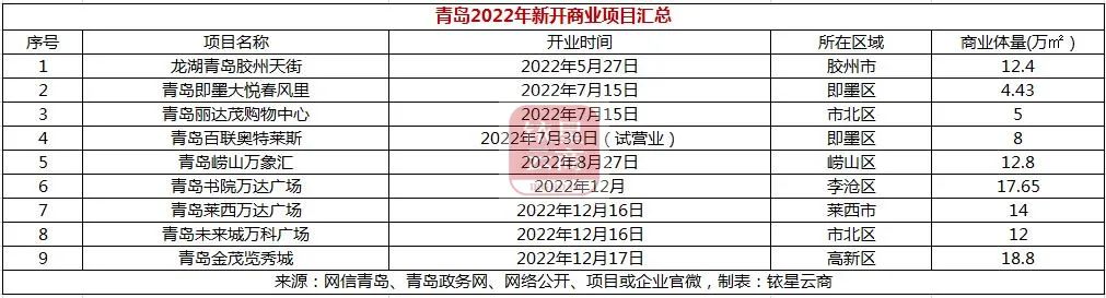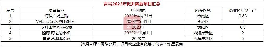 据铱星云商不完全统计,青岛2023年拟开商业体5个,面积均在5万方以下,总商业体量仅12.63万方,其中,海信广场三期、VVland蔚央地购物中心已亮相。