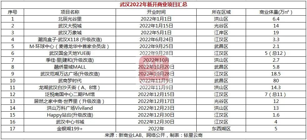 2022年,武汉新开商业体约17个,体量共213.7万㎡。赢商网数据显示,截至2022年年末,武汉购物中心总体量已超过1143万㎡,位居全国第九位。