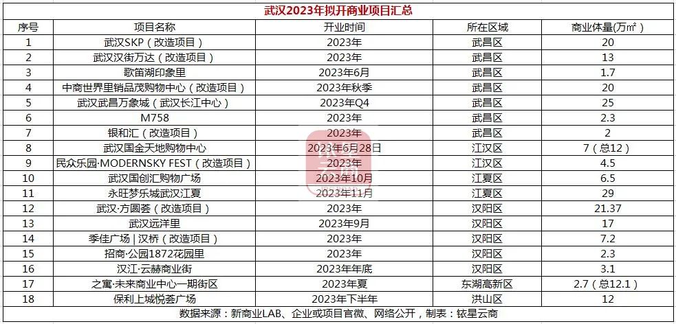 综合业内数据统计,武汉2023年全年预计开业商业项目18个,新增商业体量预计196.67万㎡。2023年,武汉将迎来SKP、汉街万达、中商世界里销品茂、方圆荟等多个大体量改造项目,带动区域商业能级提升。下文将对2023年武汉拟开业代表项目简要介绍。