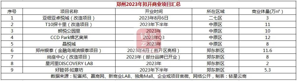 据铱星云商不完全统计,2023年郑州待开业项目9个,体量约70.9万方,其中T10探十里、郑州银泰最受关注。