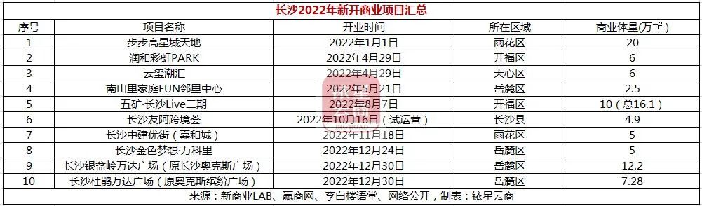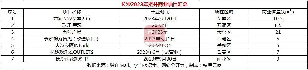 据不完全统计,2023年内,长沙市将新开商业7座,新增商业体量60万㎡。
