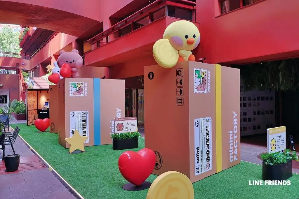 前往恒基·旭辉天地,萌系爆棚的minini门头气模强势闯入视线,bnini、conini、choniniselini、lenini……全员到齐,仿佛在欢迎着大家的踏入。除此之外,恒基·旭辉天地的楼梯、墙面、玻璃上都点缀上了minini元素,每一个拍照点都很出片;还有LINE FRIENDS快闪店惊喜限时空降,以盒子为灵感设计的店铺装置不仅贩售着超多minini周边,也是个绝佳拍照打卡点。