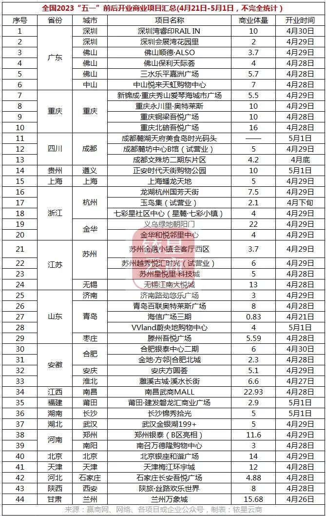 4.“五一”假期全国超40个商业项目开业,总商业体量311.81万方