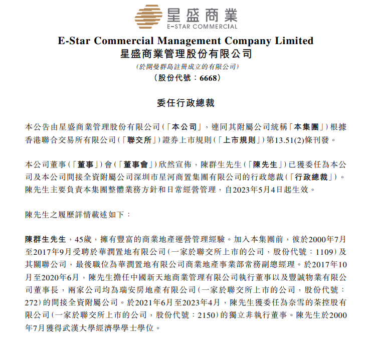 5月4日,星盛商业发布公告,正式委任陈群生为星盛商业及间接全资附属公司深圳市星河商置集团有限公司的行政总裁,负责集团整体业务方针和日常经营管理。该委任书自2023年5月4日起生效,聘期三年。