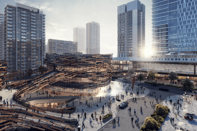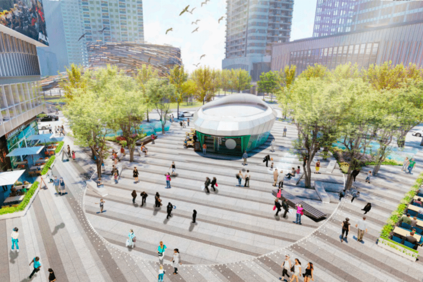 再如寒地城市的商业户外街区,这些城市往往冬季寒冷且长,夏季短暂而热,春秋季节气温波动幅度大,因此街区式项目对于室外热舒适有着极高的要求。在过往案例中,户外街区室内化是较为普遍的策略,如搭建连廊形成半封闭空间、搭建穹顶让户外街区保留街坊的游逛体验,亦或者设置更多入口空间及入口过渡空间,让消费者能更快在体感不适中得以转换等。