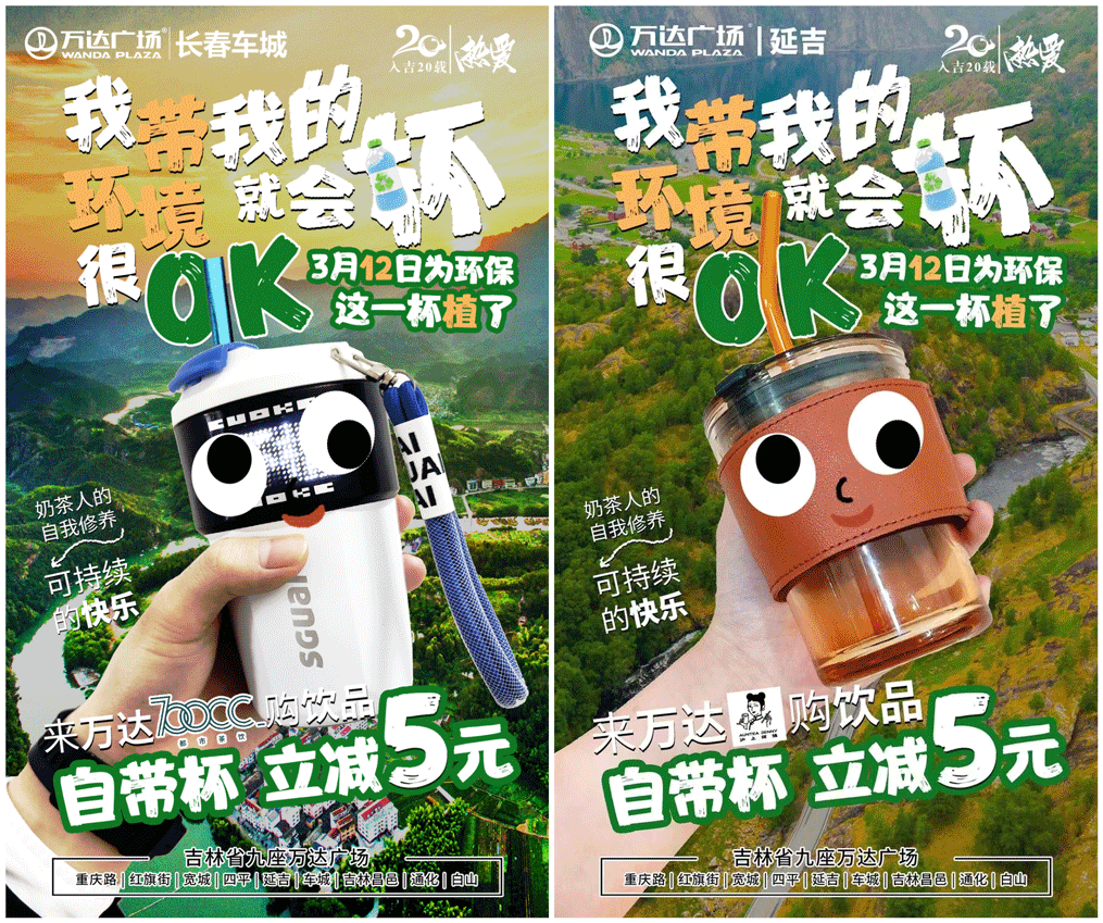 在植树节之际,万达广场北区全区发起的自创营销IP活动“这杯‘植’了”。万达广场鼓励消费者购买饮品时自带杯,为环保助一“杯”之力。此次助力环保活动共联动星巴克、喜茶、奈雪等超50个品牌、400余家门店共同参与,形成聚合效应。