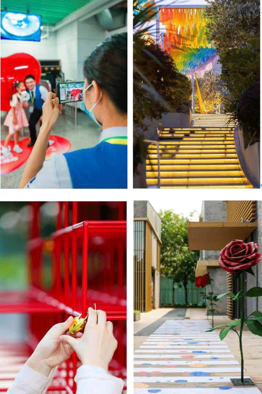 爱意令心愿滋长。欢乐海岸以爱与心愿为灵感,设置4大主题互动装置。爱心主题装置中有3个落地园区,另有1个坐落于9号线深圳湾公园地铁站,点缀一路浪漫。位于购物中心室外的“彩虹天梯”与曲水湾树荫下的“心心相荫”装置遥相呼应,到访的人们可以在此与恋人一同挂上许愿签或同心锁,纪念每一份心意。漫步曲水湾,踏过鹊桥,便是联手深圳婚礼文化地标“深礼堂艺术中心”倾力打造的爱情主题街区“喜帖街”,盛放的玫瑰花装置与精心布置的街道相映成趣,让人们仿佛置身于爱情电影之中。