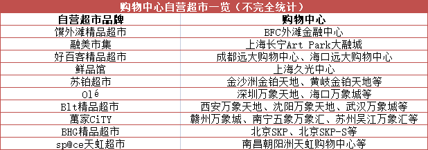 “自营超市”算是购物中心自营业务模式中,较为常见的一类。我们将它们分成两个维度来区分,一类是诸如华润集团、北京华联集团、金铂商业、天虹股份等商业地产玩家旗下孵化有的零售连锁品牌。一般而言,这类品牌已经具备规模化,除了出现在“自家”购物中心里,也会入驻其他商业项目。