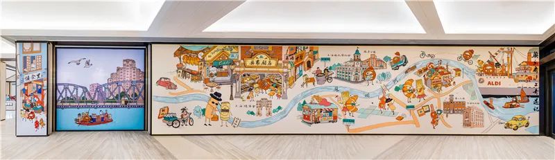 ALDI奥乐齐上海苏河湾万象天地店与知名青年插画艺术家张文绮进行合作共创,以苏州河作为画面主线,张文绮为门店绘制了"奥乐齐沪上奇遇记"艺术插画墙。