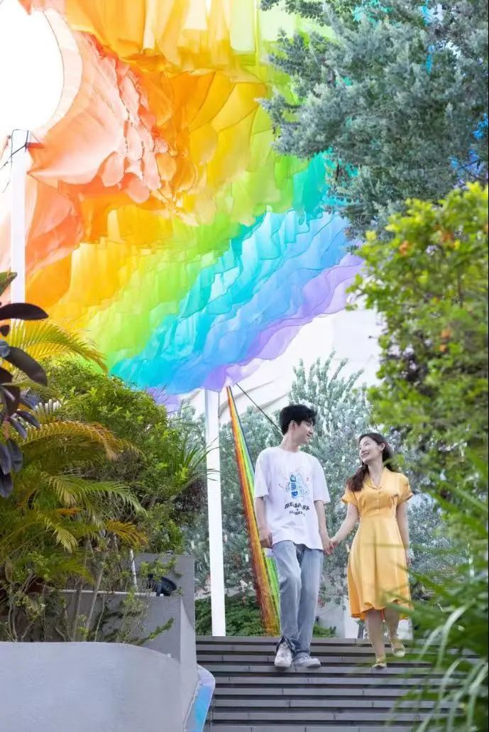 深圳欢乐海岸以爱之名,带来「爱的Mó力主题美陈」、「彩虹天梯许愿装置」、「心心相荫爱情装置」、「“喜帖街”爱情主题街区」4大情感装置。