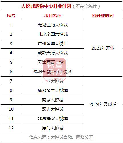 根据大悦城官方微信号及网络公开消息,铱星云商也整理出未来两三年大悦城计划开业项目清单。