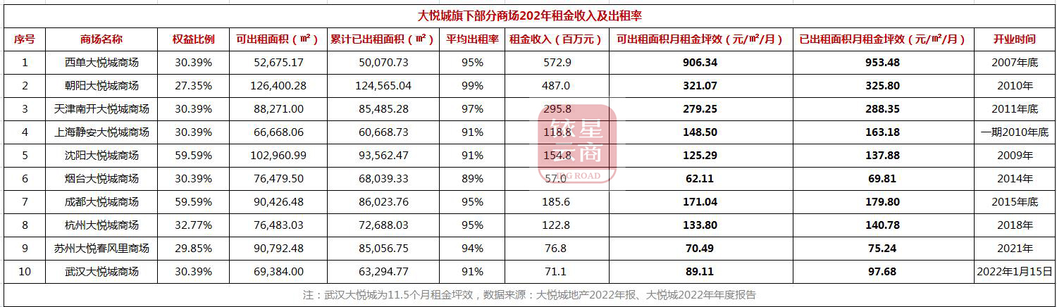 铱星云商综合大悦城地产2022年报和大悦城2022年年度报告,整理出大悦城部分购物中心租金收入情况如下。