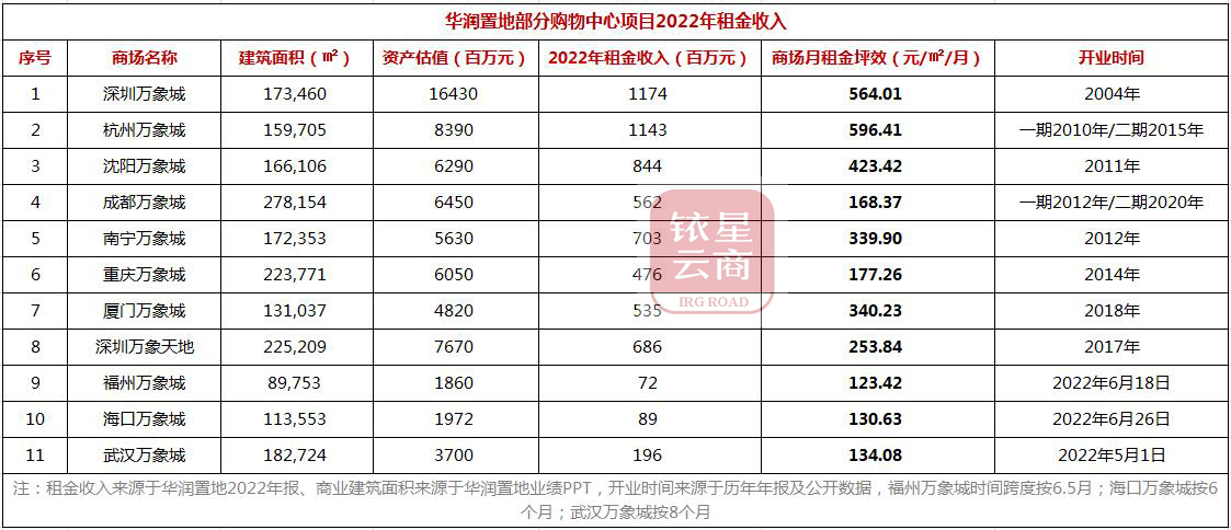 华润置地在2022年年度报告中披露了旗下如深圳万象城、杭州万象城、沈阳万象城等11个购物中心具体的年度租金收益,计算出月租金坪效最高的为杭州万象城,达596.41元/㎡/月。