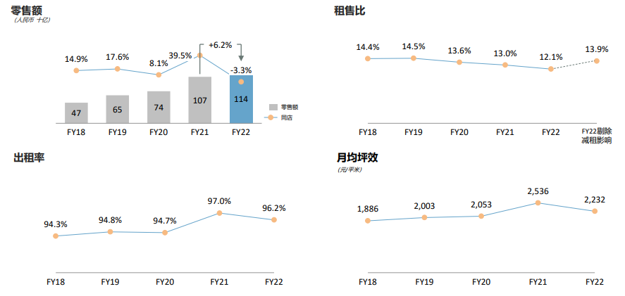 集团旗下购物中心零售额同比增长6.2%至1137亿元,整体出租率维持96.2%。月均零售坪效维持在2232元/平米,租售比12.1%,还原减租影响后,租售比仍维持在13.9%相对低位,未来租金收入仍有充足上升空间。