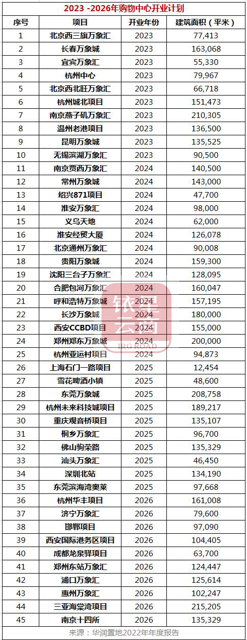 华润置地在2022年年度报告中亦披露了未来4年即将开业的购物中心名单,总数量高达45个,其中2023年计划开业10个项目。