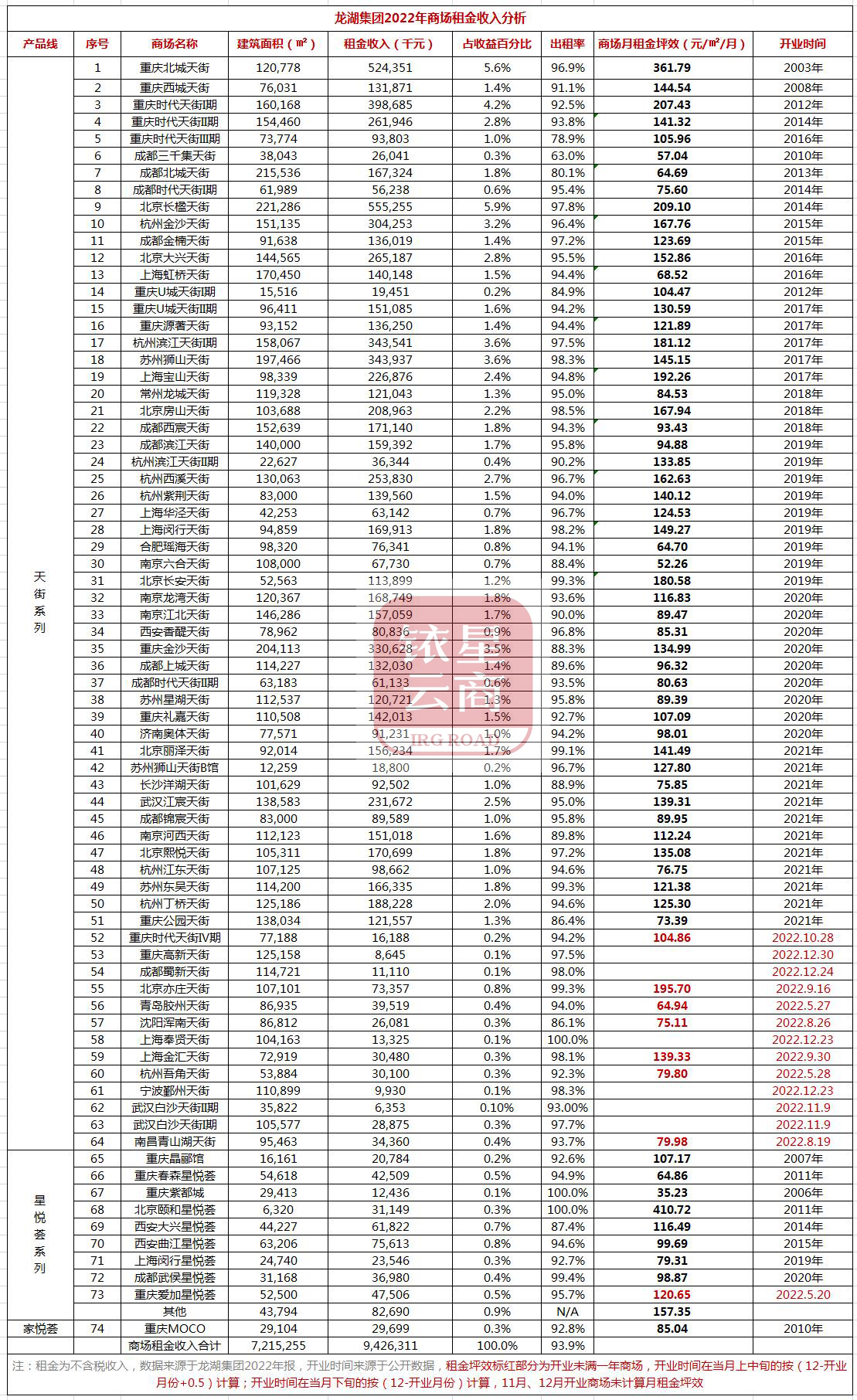 龙湖在2022年年报中列出旗下74个商场的具体租金收入,如下表: