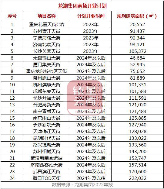 龙湖商业2023年、2024年及以后开业商场达24个,2023年计划开业5座商场,其中长沙芙蓉天街已于5月20日开业。
