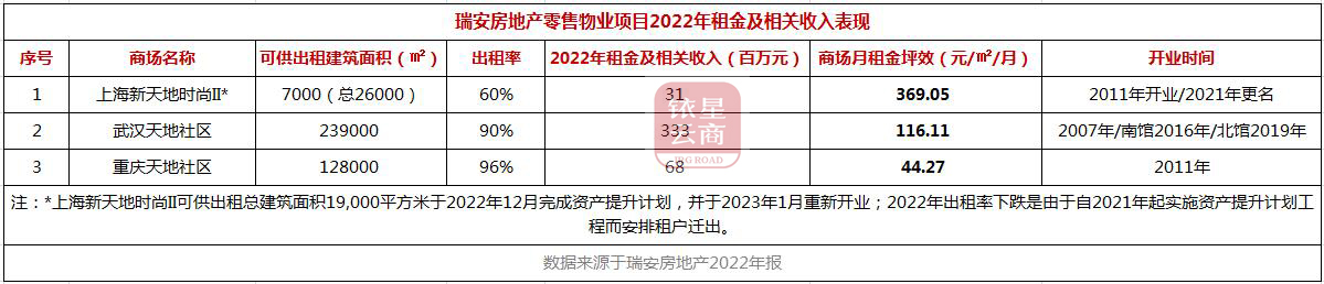截至2022年12月31日,零售物业组合的出租率平均为89%。2022年报中,瑞安新天地旗下纯零售出租物业仅有3个项目租金数据,如下表: