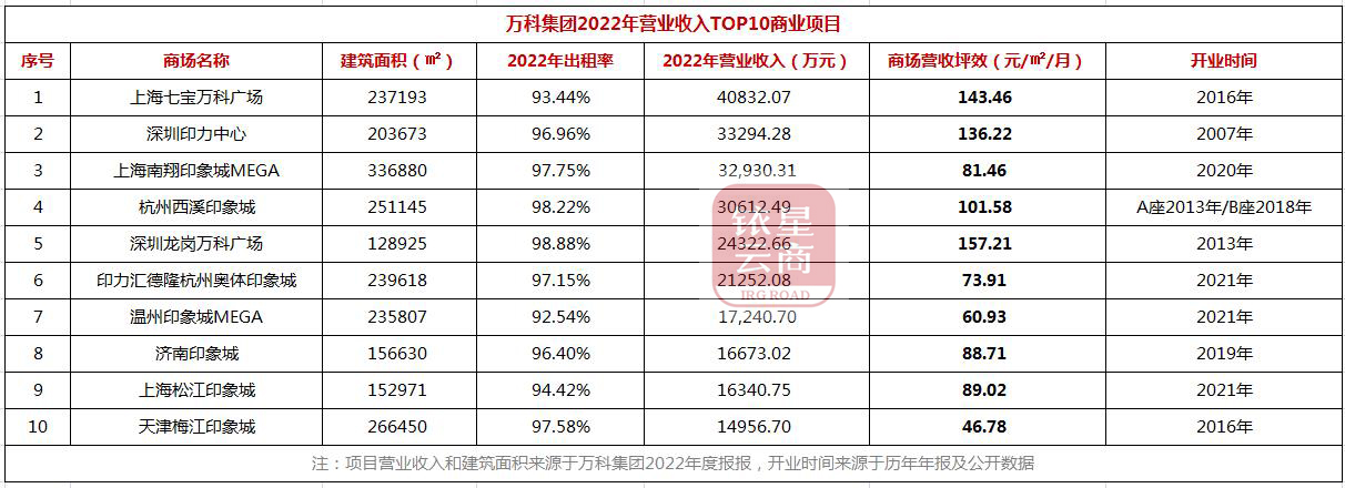 万科集团在年度报告中披露了旗下2022营业收入TOP10商场名单,包括上海七宝万科广场、深圳印力中心、上海南翔印象城 MEGA、杭州西溪印象城、深圳龙岗万科广场等。而印力汇德隆杭州奥体印象城、温州印象城MEGA、上海松江印象城均为2021年下半年开业的项目。
