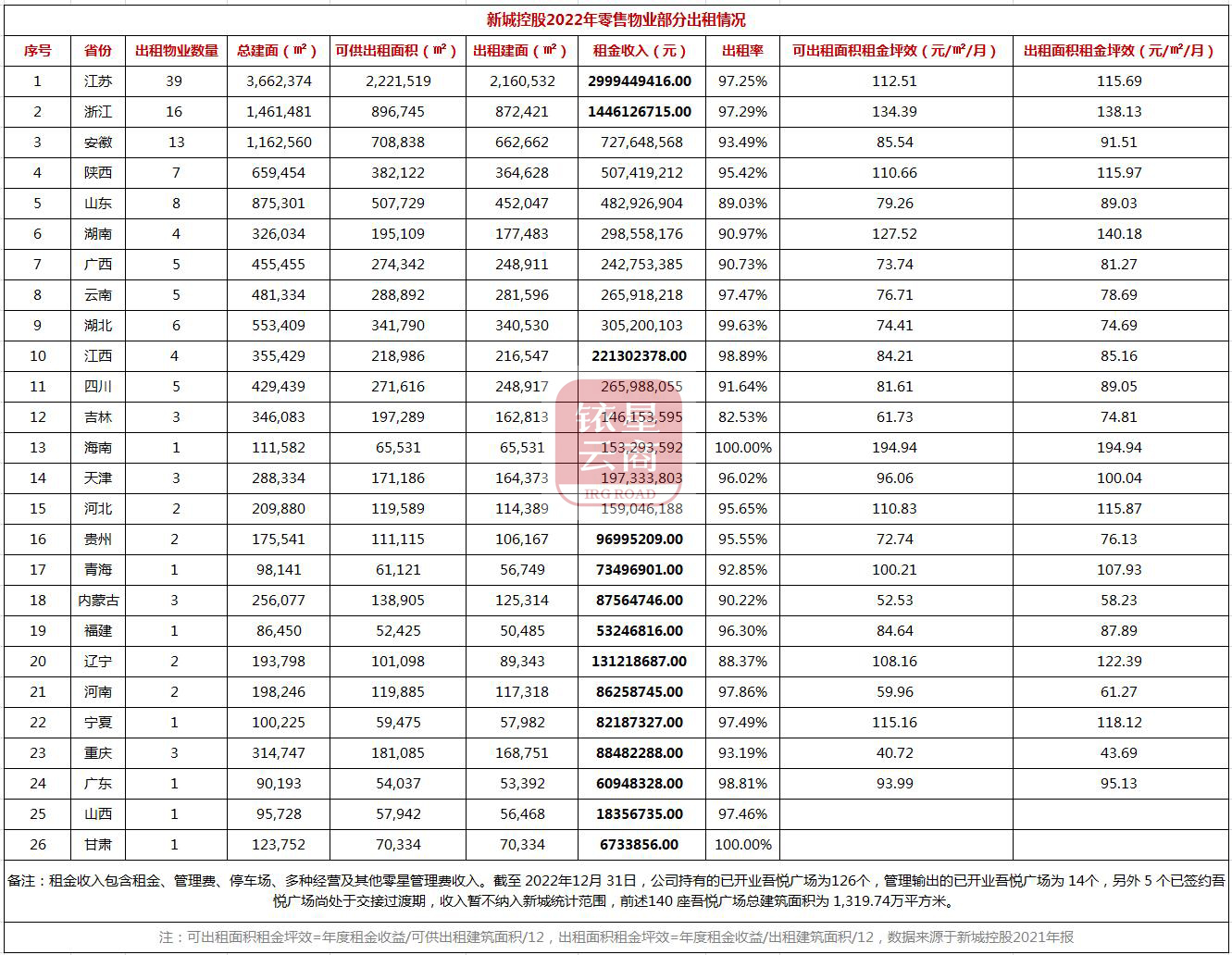年报中,新城控股按省份披露了对应的购物中心数量、建筑面积、平均出租率及出租面积的租金收入情况。具体如下