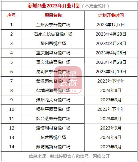 2023年,新城控股计划新开吾悦广场及委托管理在营项目20座,全年商业运营收入目标为110亿元。其中,兰州安宁吾悦广场、石家庄长安吾悦广场、滕州吾悦广场、重庆铜梁吾悦广场、重庆北碚吾悦广场、昆明晋宁吾悦广场等6个项目已正式开业。