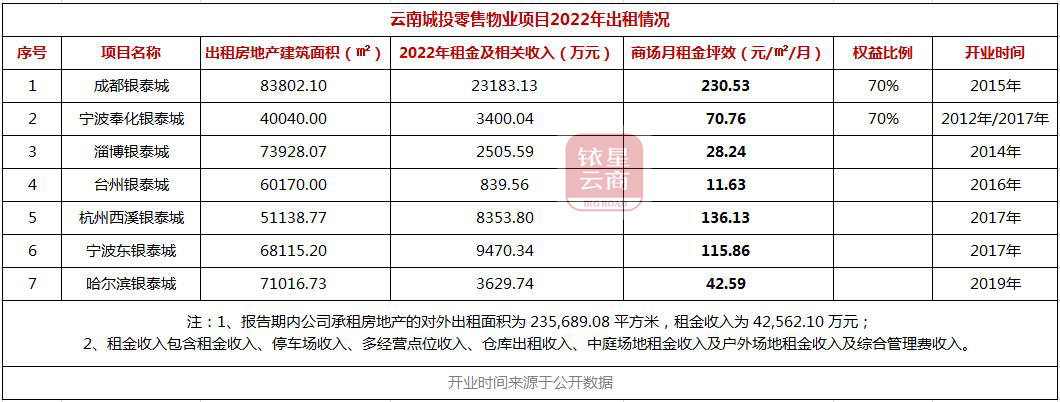 云南城投2022年报显示,报告期内公司承租房地产的对外出租面积为 235,689.08 平方米,租金收入为42,562.10 万元,根据前述两数值可得出云南城投2022年商场月租金坪效为150.49元/㎡/月,在行业内还属于不错的水平。2022年云南城投自持商场的出租情况如下表: