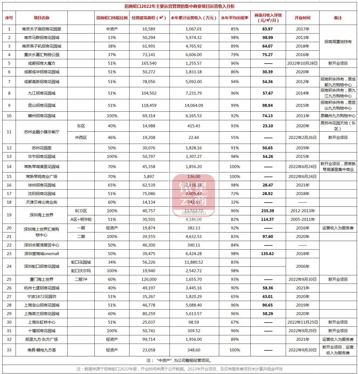 在2022年年度报告中,招商蛇口也披露了公司主要运营管理的集中商业项目的全年运营收入情况。