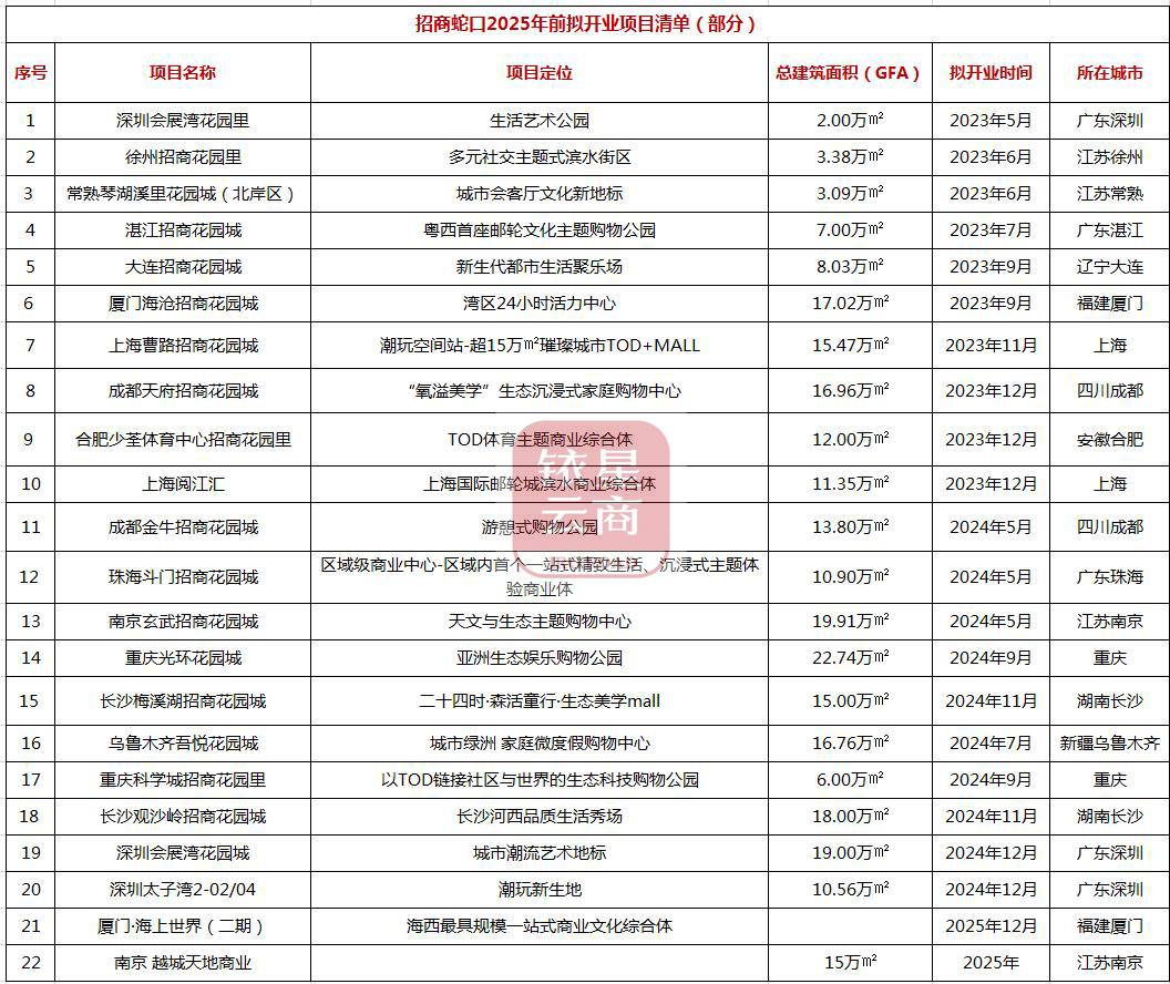 继2021年首次提出持有物业“双百”战略后,会上,招商商管董事长袁嘉骅此次再提“双百”战略。招商商管将持续不断拓展全新商业项目,主动布局优质区位,重点聚焦一线、新一线。目标至2025年实现购物中心100座,持有物业营收100亿元。同时,招商商管也释出部分筹开项目名单,其中,深圳会展湾花园里已于4月29日亮相营业。